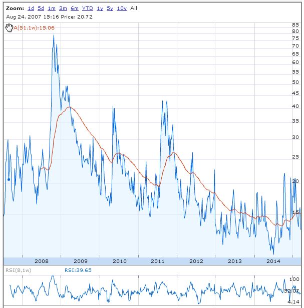 Volatility is often denoted as VIX (ticker symbol for Chicago Board Options Exchange Market Volatility Index). VIX measures the implied violability of the S&P500 index. As depicted in the chart below, implied volatility peaked at 2008/2009 Great Recession. Investors and traders alike are less confident in the market.